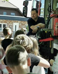der Ortsbrandmeister Michael van der Ahe in einer Besprechung mit einem seiner Gruppenführer befand.