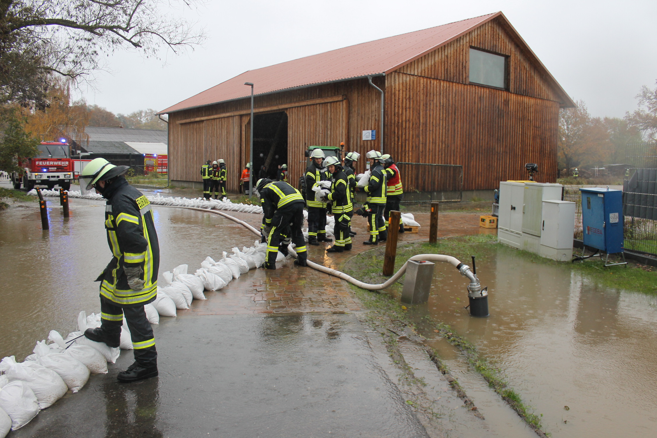 alarmiert, um umliegende Wohngebäude mit Sandsäcken vor dem steigenden Wasser zu