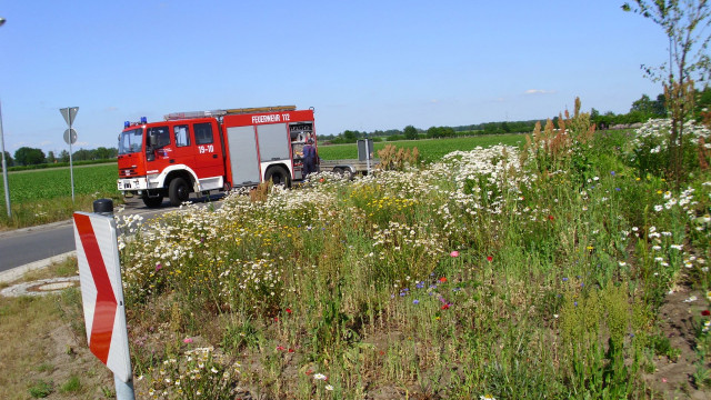 und fuhren mit ihrem Löschfahrzeug raus, um den Durst der Blumen in den