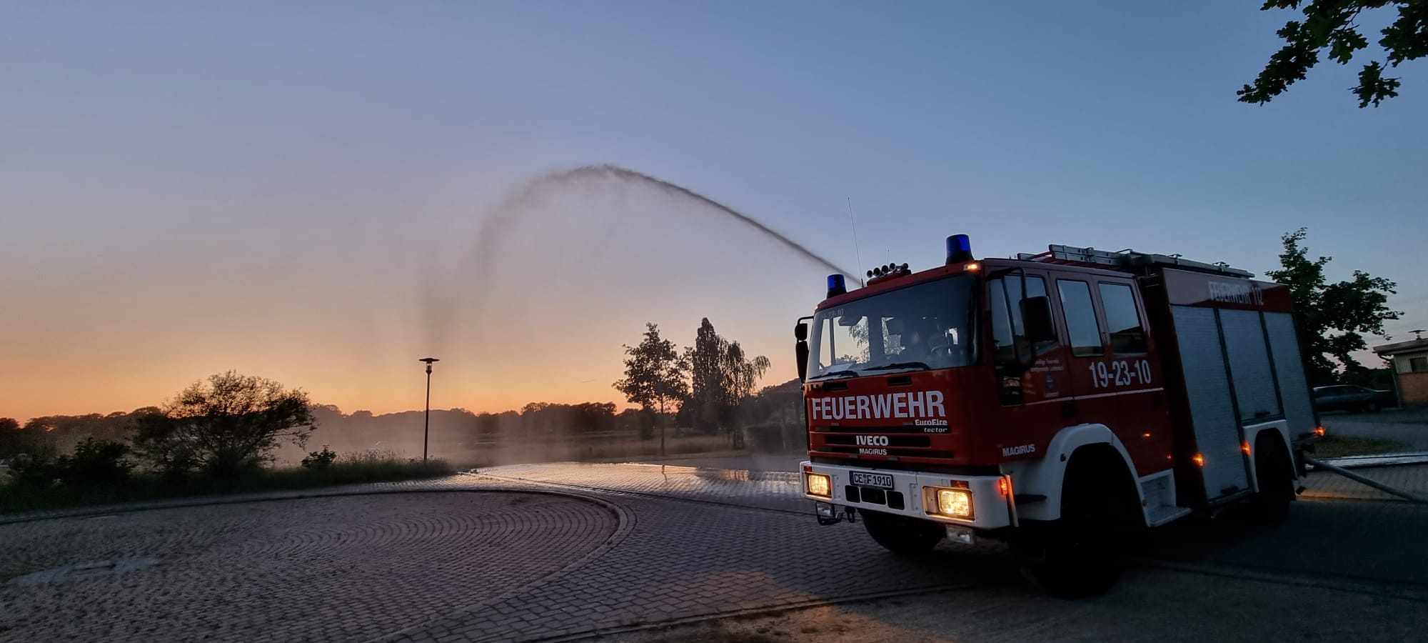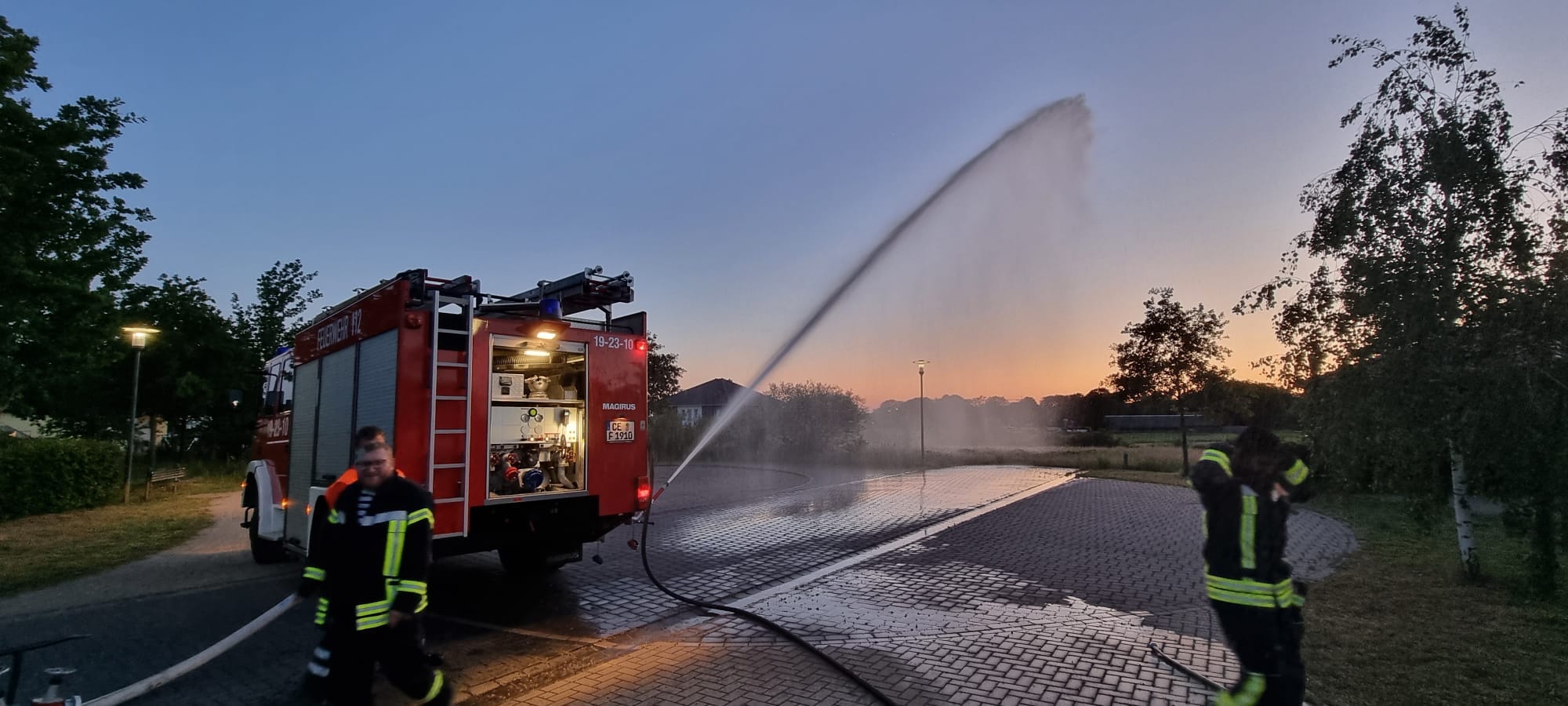 Dort haben wir mit dem Düsenschlauch und dem Hydroschild eine Wasserwand hergestellt.