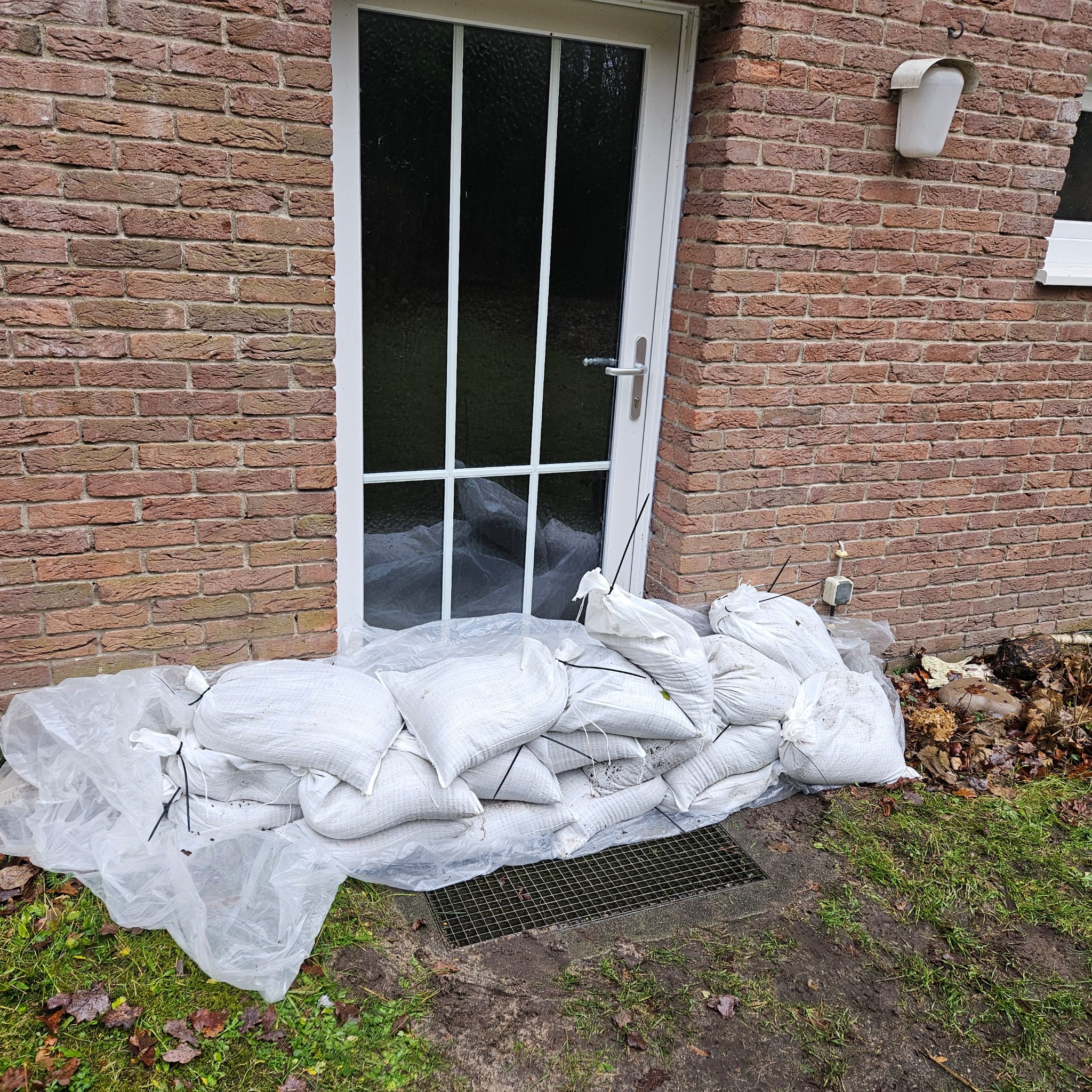 Kellereingang eines Hauses vorsorglich mit Sandsäcken gesichert.